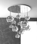 Sospensione 12 luci della serie FUTURE di Top Light, con rosone rotondo in metallo cromato e 12 ampolle in vetro pirex di diverso diametro disponibile nelle finiture trasparente, ambra, cromo, oro e rame che riducono solo parzialmente l’emissione luminosa. Cavi regolabili in lunghezza.