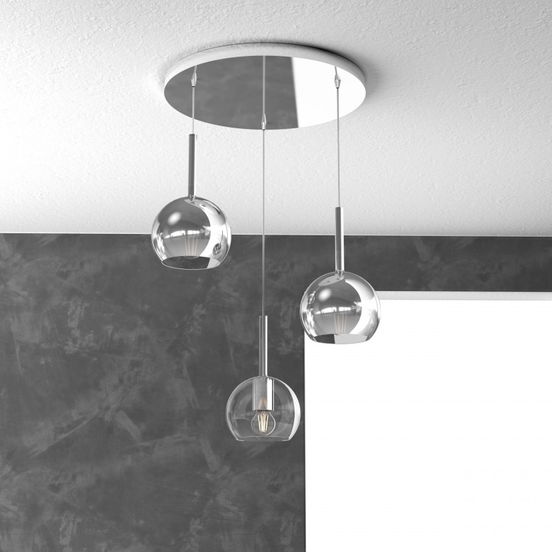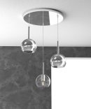 Sospensione a 3 luci della serie FUTURE di Top Light, con rosone tondo in metallo cromato e 3 ampolle in vetro pirex Ø15cm, finiture un vetro trasparente e due vetri cromo.