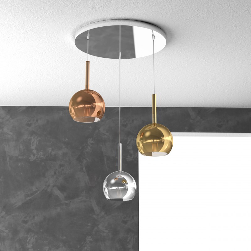 Sospensione a 3 luci della serie FUTURE di Top Light, con rosone tondo in metallo cromato e 3 ampolle in vetro pirex d.15cm nelle finiture cromo, oro e rame che riducono solo parzialmente l’emissione luminosa.