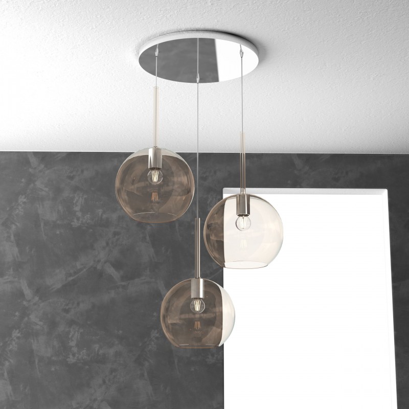 Sospensione a 3 luci della serie FUTURE di Top Light, con rosone tondo in metallo cromato e 3 ampolle in vetro pirex diametro 25 cm finitura ambra.