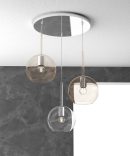 Sospensione a 3 luci della serie FUTURE di Top Light, con rosone tondo in metallo cromato e 3 ampolle in vetro pirex diametro 20 cm disponibile nelle finiture trasparente, ambra, cromo, oro e rame che riducono solo parzialmente l’emissione luminosa.
