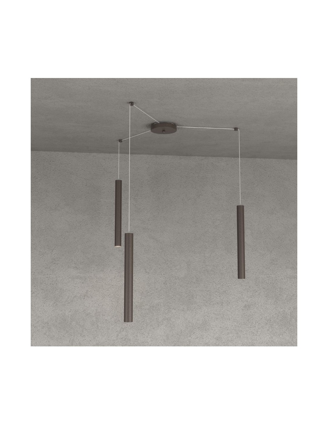 ROUND TUBE S3 é una lampada a sospensione del brand italiano Top Light, realizzata con 3 elementi tubolari a sezione tonda in metallo ultrasottile verniciato marrone, rosone rotondo e cavi regolabili in lunghezza. Dotata di sistema di decentramento mediante cui é possibile posizionare i diffusori distanti l’uno dall’altro in base alle vostre esigenze di illuminazione.