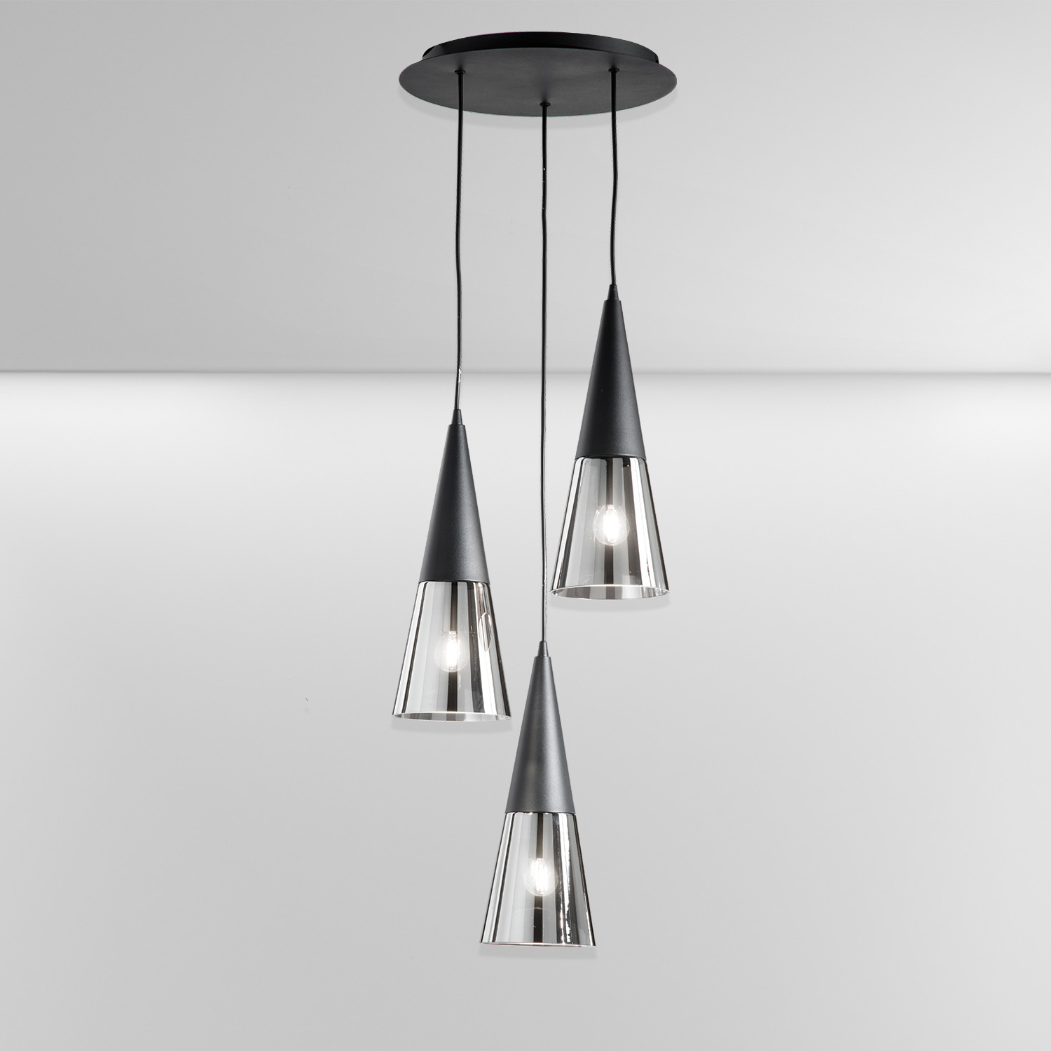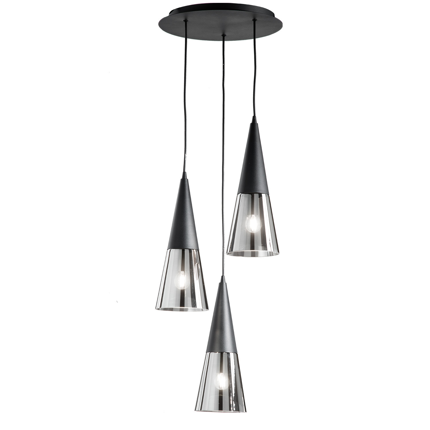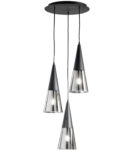 • La sospensione TRENTO é realizzata con montatura in metallo nero e diffusori a forma di cono rovesciato in vetro soffiato trasparente.