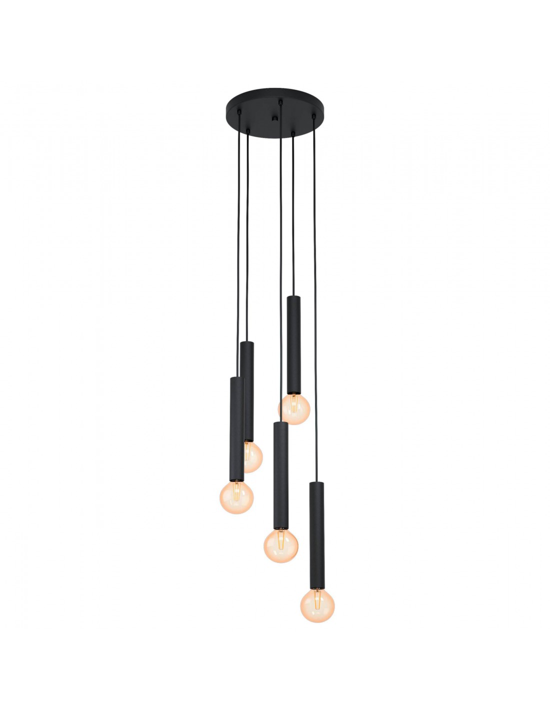 La lampada a sospensione CORTENOVA del brand EGLO presenta una struttura realizzata in metallo da un rosone rotondo, cavi regolabili e 5 portalampada cilindrici E27 colore nero.