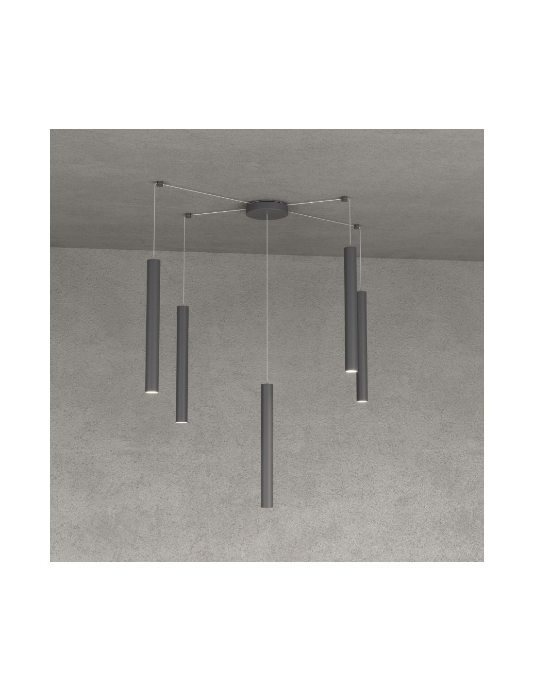ROUND TUBE S5 é una lampada a sospensione del brand italiano Top Light, realizzata con 5 elementi tubolari a sezione tonda in metallo ultrasottile verniciato grigio antracite, rosone rotondo e cavi regolabili in lunghezza. Dotata di sistema di decentramento mediante cui é possibile posizionare i diffusori distanti l’uno dall’altro in base alle vostre esigenze di illuminazione.
