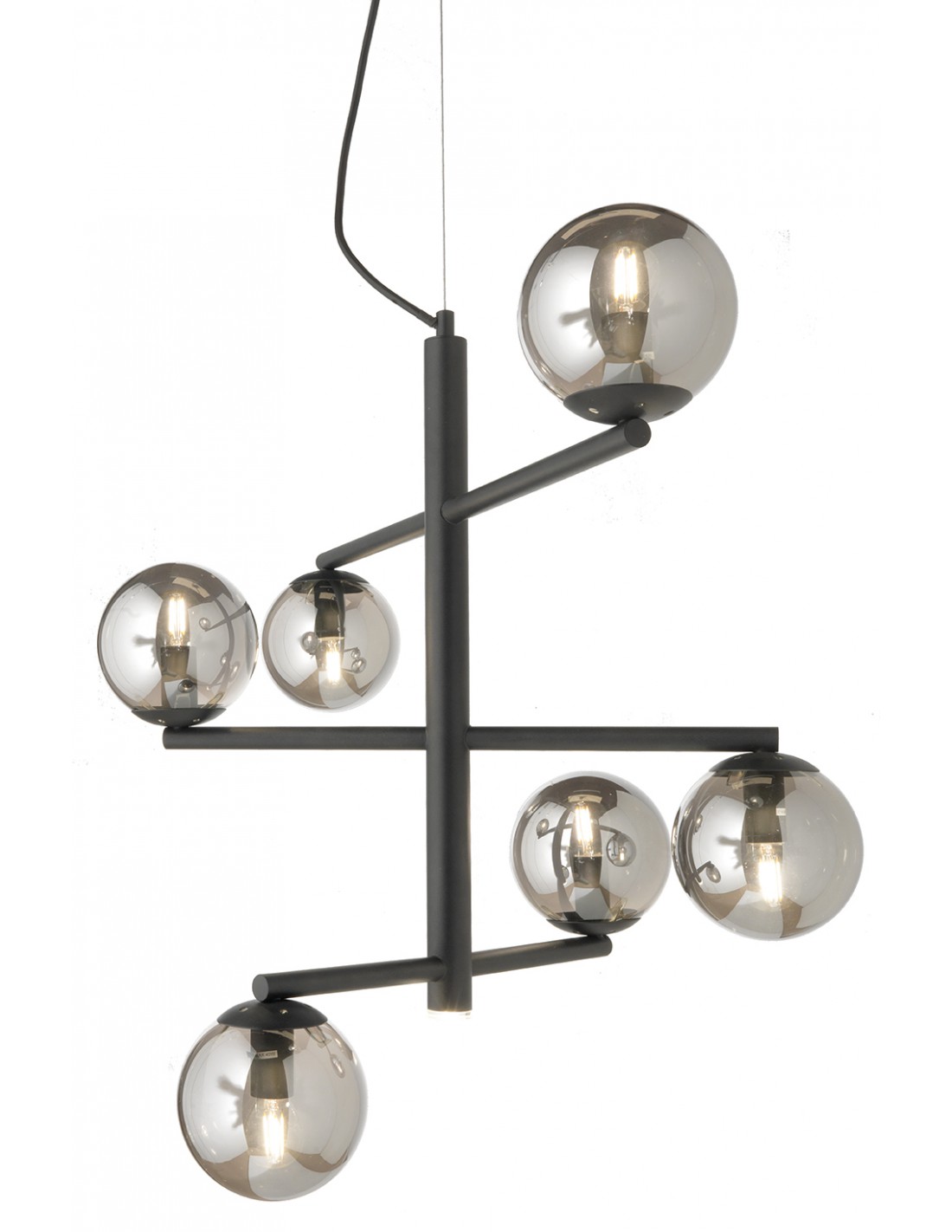 - La sospensione GIZAH, caratterizzata da una forma che ricorda un albero, é composta da struttura cilindrica centrale in metallo verniciato nero da cui si diramano 6 aste con 6 diffusori a palla in vetro soffiato fumè. Cavetto regolabile in lunghezza.