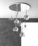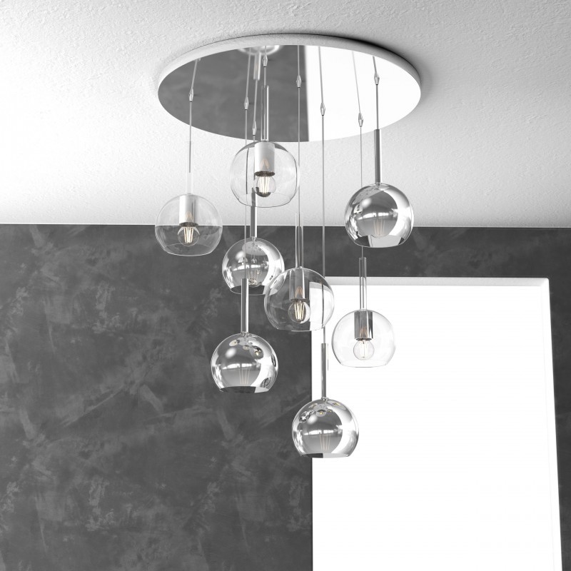 Sospensione a 8 luci della serie FUTURE di Top Light, con rosone rotondo in metallo cromato e 8 ampolle in vetro pirex diametro 15 cm disponibile nelle finiture trasparente, ambra, cromo, oro e rame che riducono solo parzialmente l’emissione luminosa. Cavi regolabili in lunghezza.