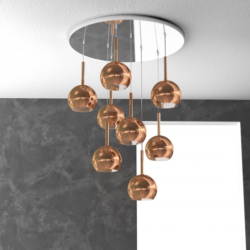Sospensione a 8 luci della serie FUTURE di Top Light, con rosone rotondo in metallo cromato e 8 ampolle in vetro pirex diametro 15 cm disponibile nelle finiture trasparente, ambra, cromo, oro e rame che riducono solo parzialmente l’emissione luminosa. Cavi regolabili in lunghezza.