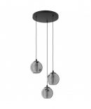 La sospensione ARISCANI del brand EGLO presenta una struttura in metallo verniciato nero e 3 diffusori a forma di sfera forata in vetro finitura fumé.