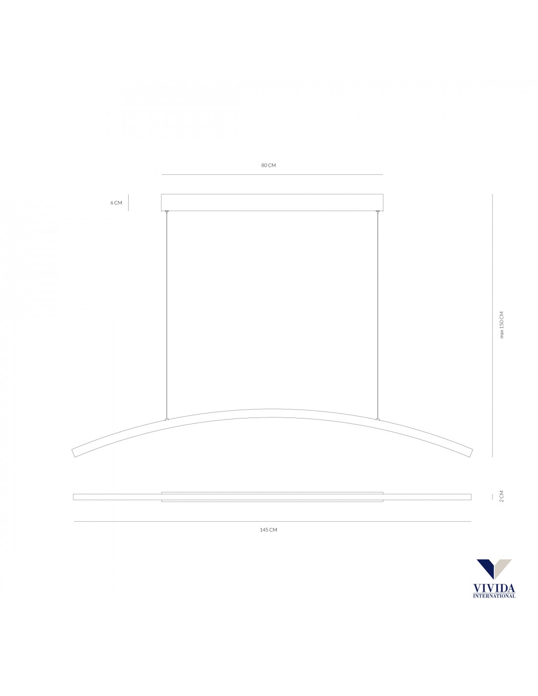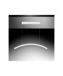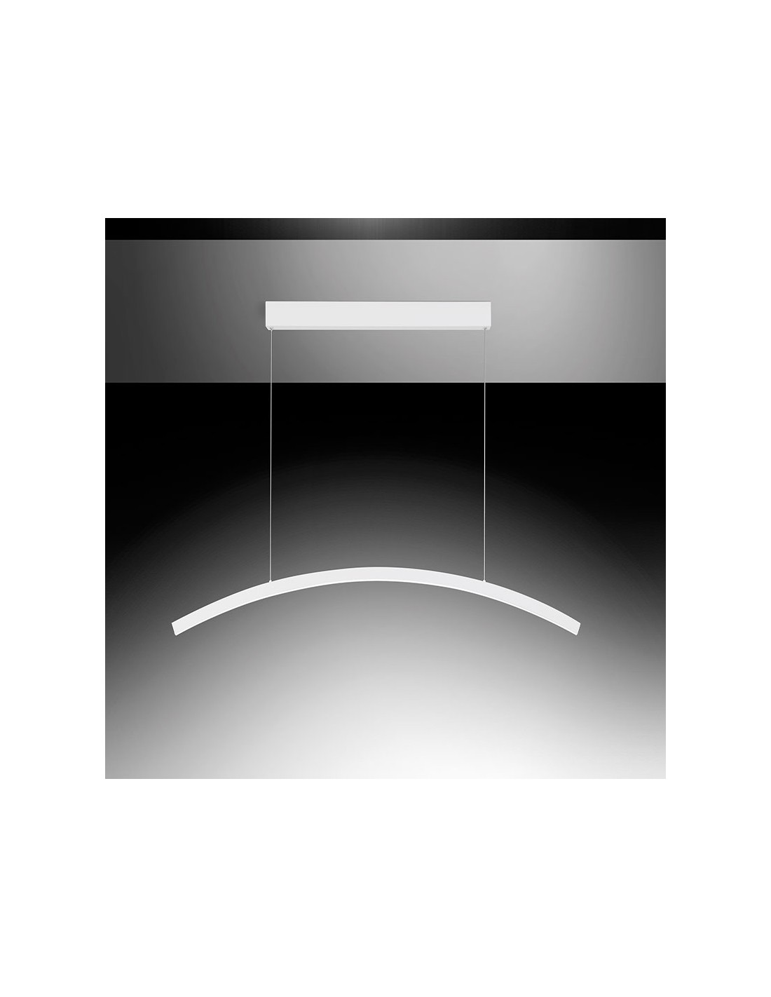 La sospensione BOW del marchio VIVIDA INTERNATIONAL presenta una struttura in alluminio finitura bianco, composta da rosone rettangolare, fili regolabili e diffusore ad arco in policarbonato.