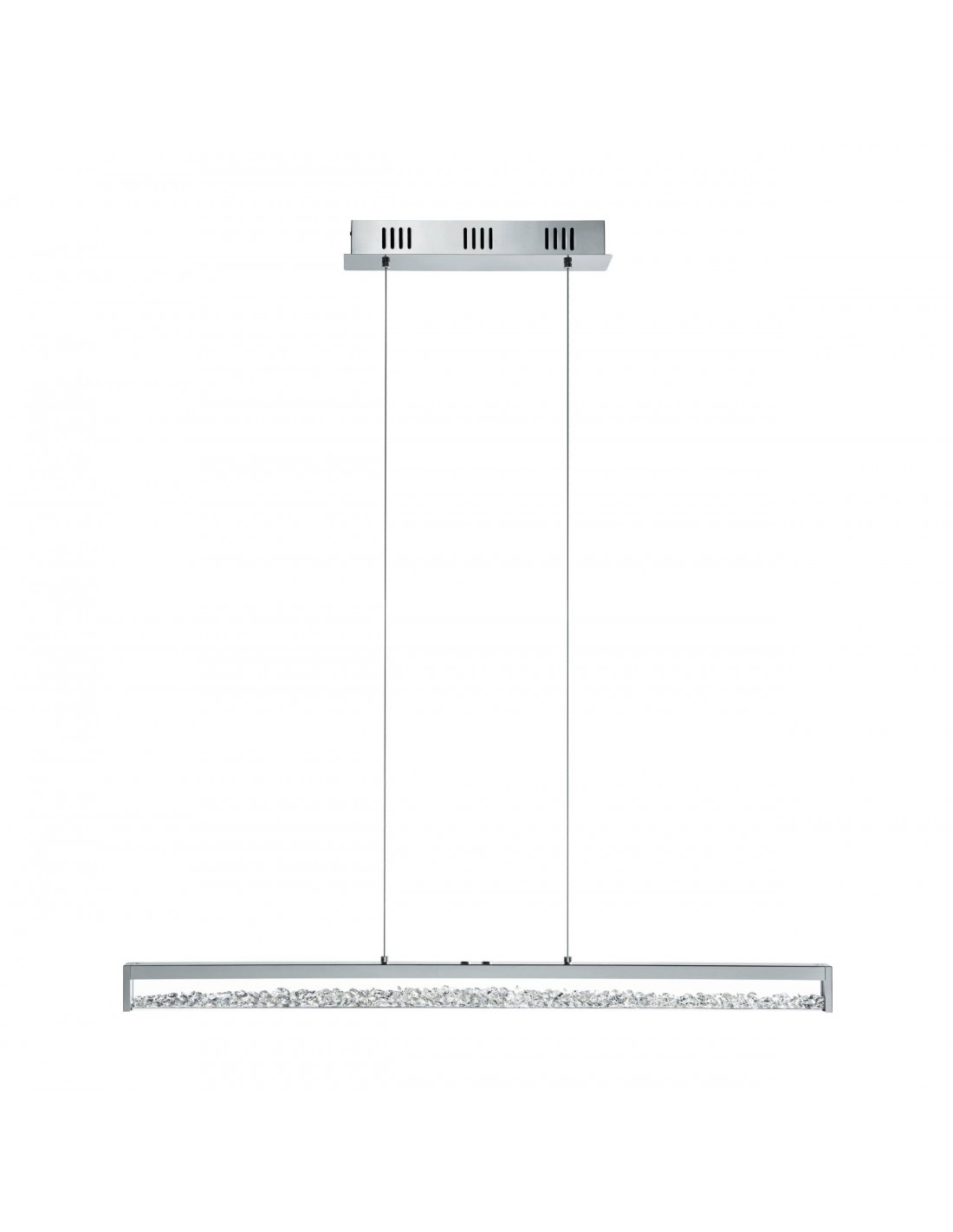 La sospensione CARDITO del brand EGLO presenta una struttura lineare in metallo e alluminio finitura cromo e diffusore rettangolare in vetro e cristallo.