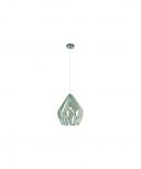 La sospensione CARLTON-P presenta un rosone rotondo e diffusore in metallo tagliato a laser caratterizzato da forme geometriche irregolari stile origami, colore verde chiaro.