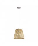 La sospensione KIRKCOLM del brand EGLO presenta una struttura in metallo finitura nichel opaco, con diffusore a cupola in legno decorato da rombi intrecciati finitura legno naturale.