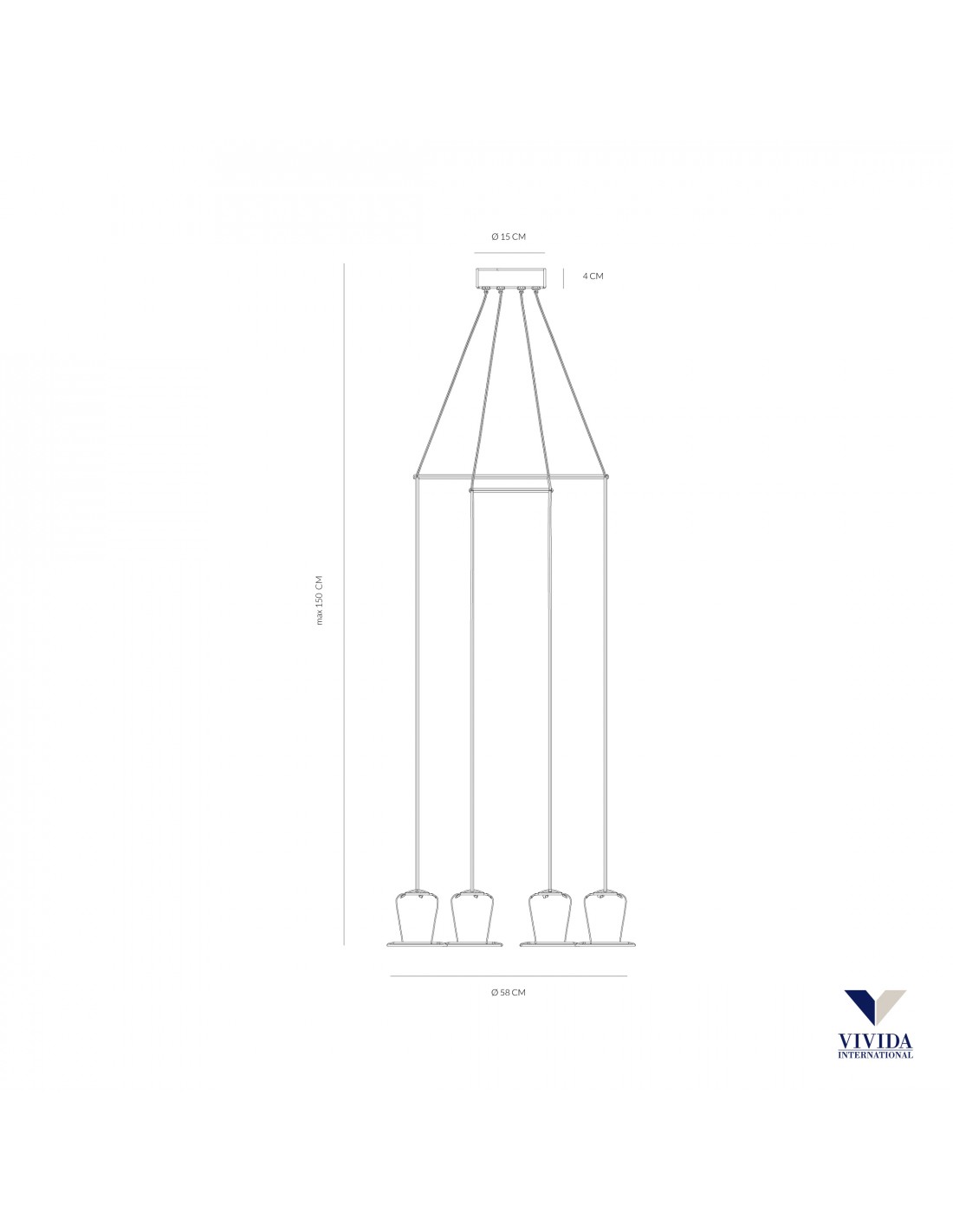 La sospensione a 4 luci MARYON presenta una montatura in alluminio finitura marrone ossidato, rosone rotondo, cavi regolabili e diffusori sferici avvolti da vetri trasparenti che richiamano la forma di cappelli a cilindro.