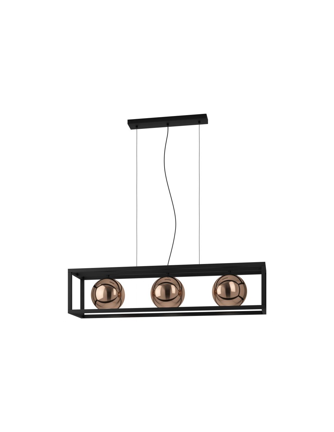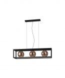 Il lampadario a sospensione CORDOBA del brand EGLO presenta una montatura in metallo finitura nero dalla forma di una scatola rettangolare aperta. I 3 paralumi sono sferici in vetro vaporizzato in tinta rame.