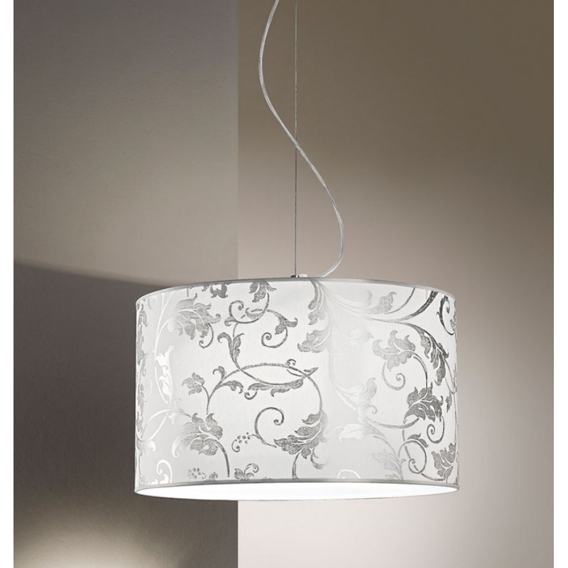 • Sospensione con struttura in metallo verniciato bianco con dettagli cromo lucido. Paralume in tessuto bianco arabescato argento. Il cavo in acciaio può essere regolato in altezza fino a 120 cm.