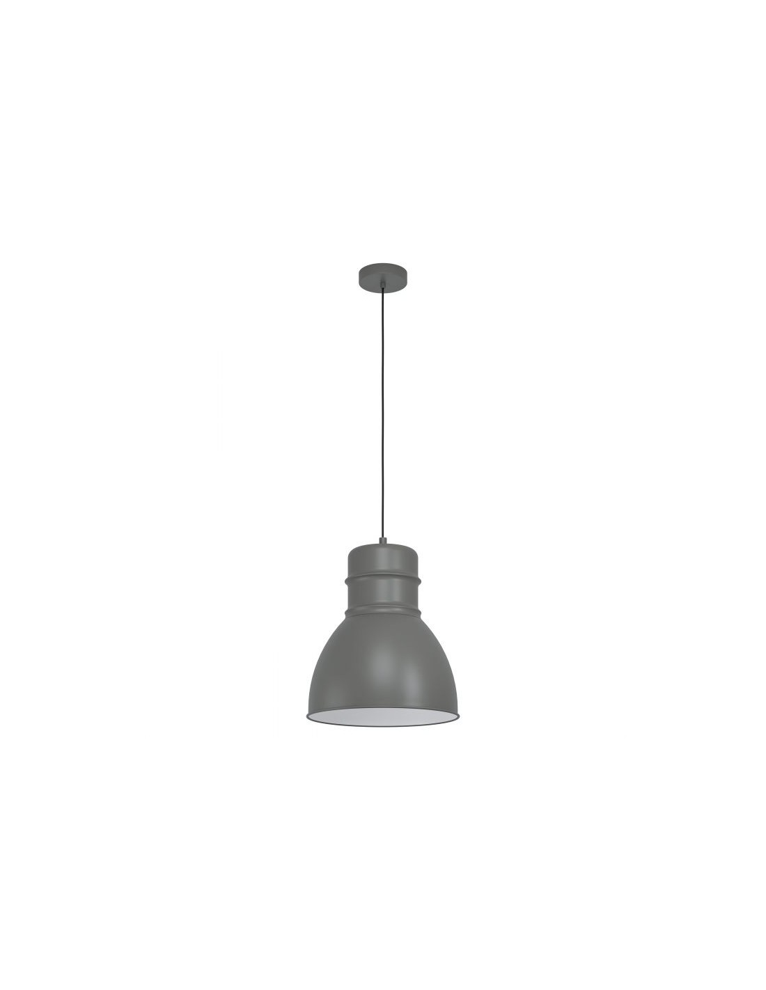 La lampada a sospensione EBURY del brand Eglo presenta una struttura in metallo grigio con diffusore a forma di cupola e interno color bianco.