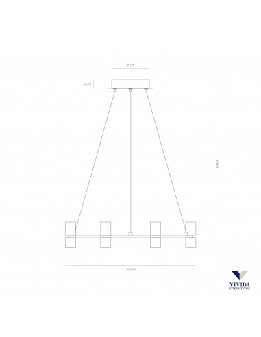 La sospensione KINGFORT del marchio VIVIDA INTERNATIONAL presenta una montatura in ferro finitura nero composta da rosone quadrato, cavi regolabili ed elemento quadrato con 8 diffusori cilindrici a led integrato.