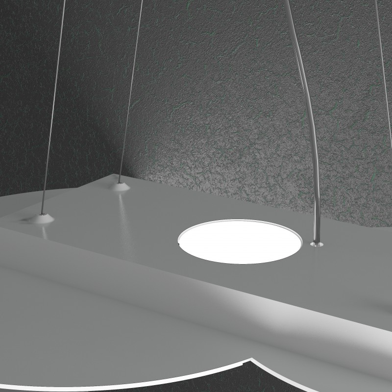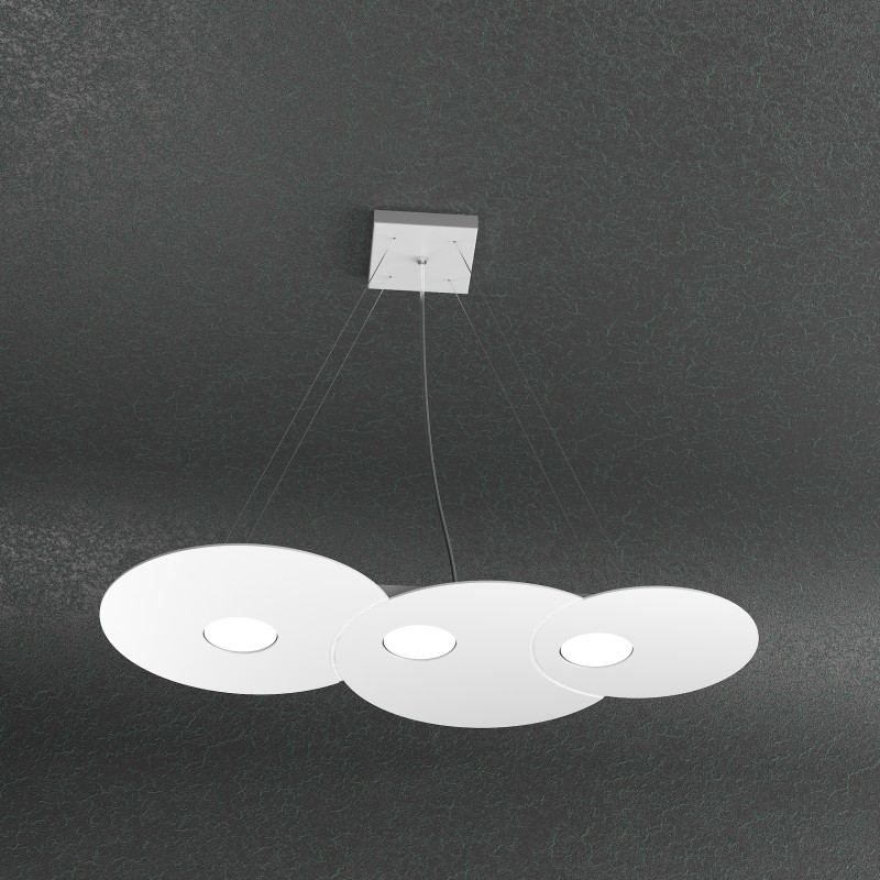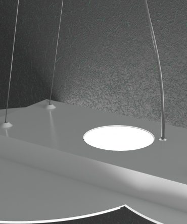 Questa sospensione della serie Cloud, prodotto Top Light made in Italy, è composta da una sottile lastra in metallo verniciato, con incisioni che ne definiscono la forma, sostenuta da quattro cavi d’acciaio regolabili in base all’altezza dal soffitto che si vuole ottenere.
