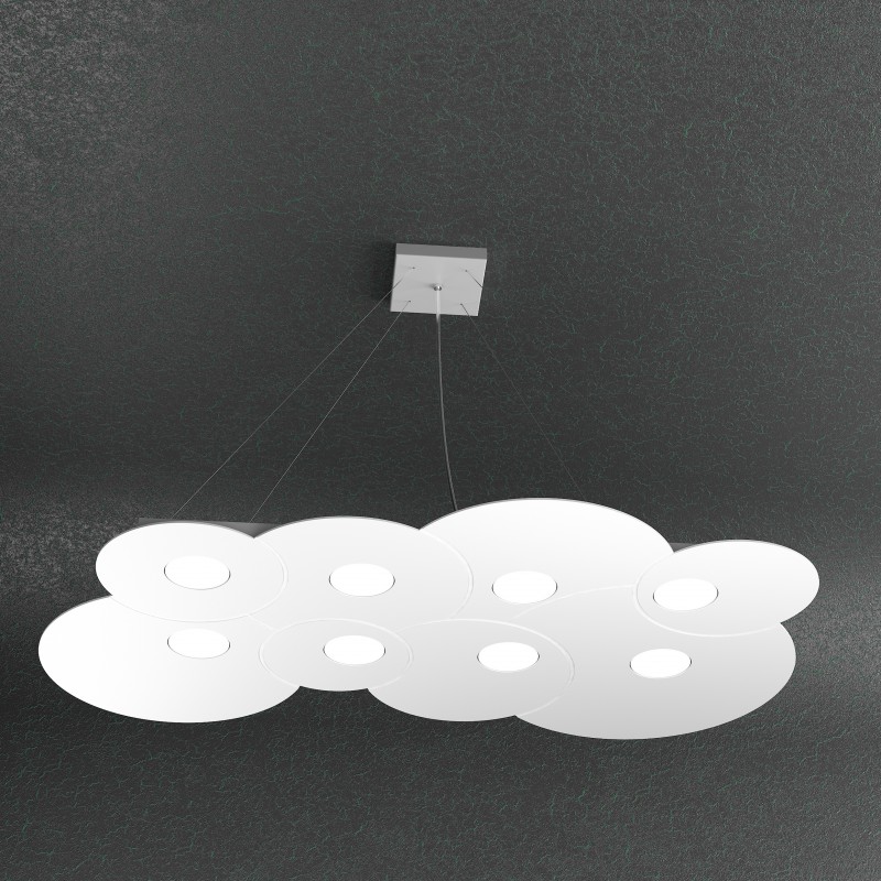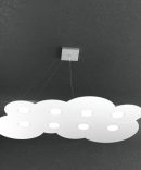 Questa sospensione della serie Cloud, prodotto Top Light made in Italy, è composta da una sottile lastra in metallo verniciato, con incisioni che ne definiscono la forma, sostenuta da quattro cavi d’acciaio regolabili in base all’altezza dal soffitto che si vuole ottenere.