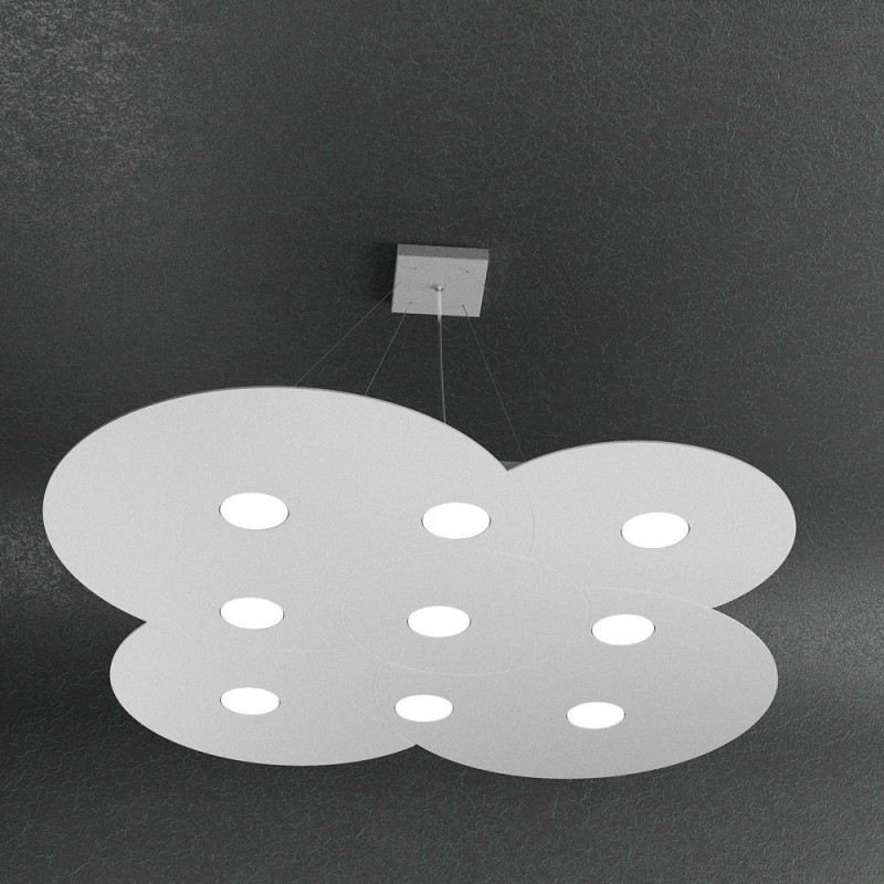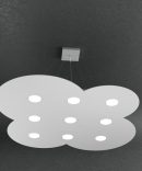 Questa sospensione della serie Cloud, prodotto Top Light made in Italy, è composta da una sottile lastra in metallo verniciato, con incisioni che ne definiscono la forma, sostenuta da quattro cavi d’acciaio regolabili in base all’altezza dal soffitto che si vuole ottenere.