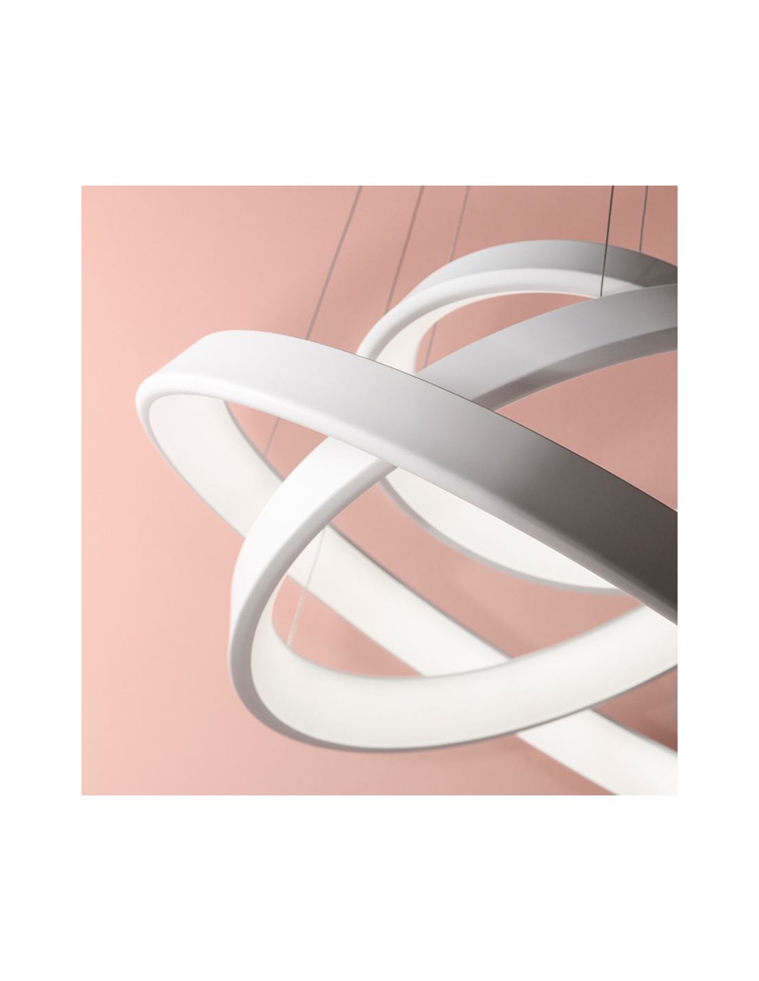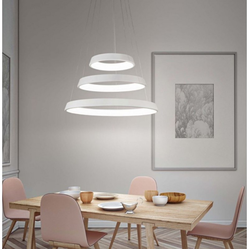 Sospensione della serie ANELLI DIODI di Affralux, composta da tre anelli concentrici realizzati in alluminio verniciato bianco finitura satinata con diffusore interno in PMMA.