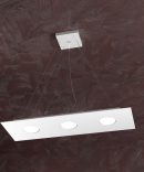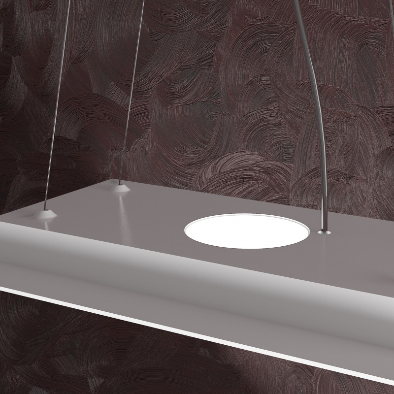 La sospensione della serie AREA, prodotta dal brand italiano Top Light, è composta da una sottile lastra in metallo verniciato, sostenuta da quattro cavi d’acciaio regolabili in base all’altezza dal soffitto che si vuole ottenere.