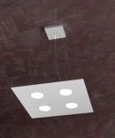 La sospensione della serie AREA, prodotta dal brand italiano Top Light, è composta da una sottile lastra in metallo verniciato, sostenuta da quattro cavi d’acciaio regolabili in base all’altezza dal soffitto che si vuole ottenere.