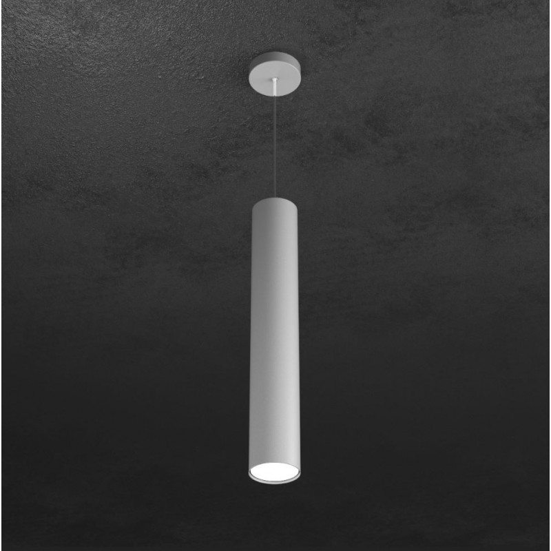 Questa sospensione della collezione Shape è composta da un diffusore tubolare realizzato in metallo verniciato grigio e cavo elettrico regolabile in lunghezza.