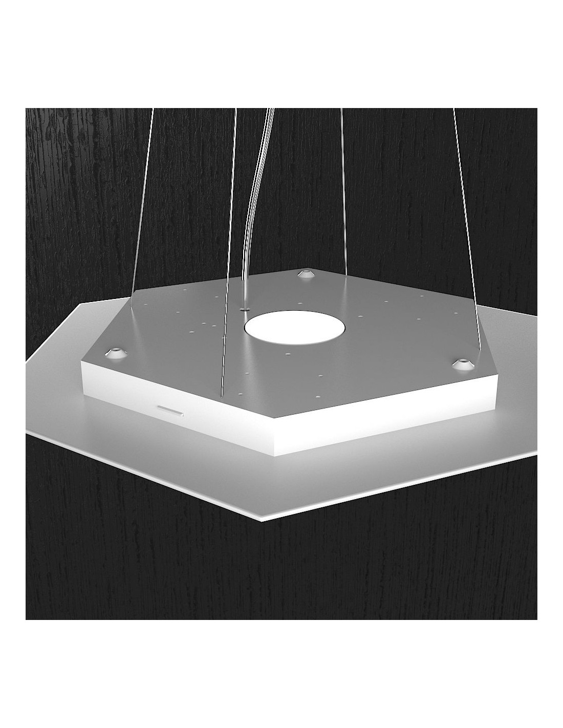 La sospensione della collezione HEXAGON é composta da una sottile piastra a forma di esagono realizzata in metallo verniciato. Questo modello permette di aggiungere una luce disposta sul lato superiore della piastra per illuminare il soffitto, in modo da uniformare la luminosità. Cavi regolabili in lunghezza.