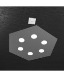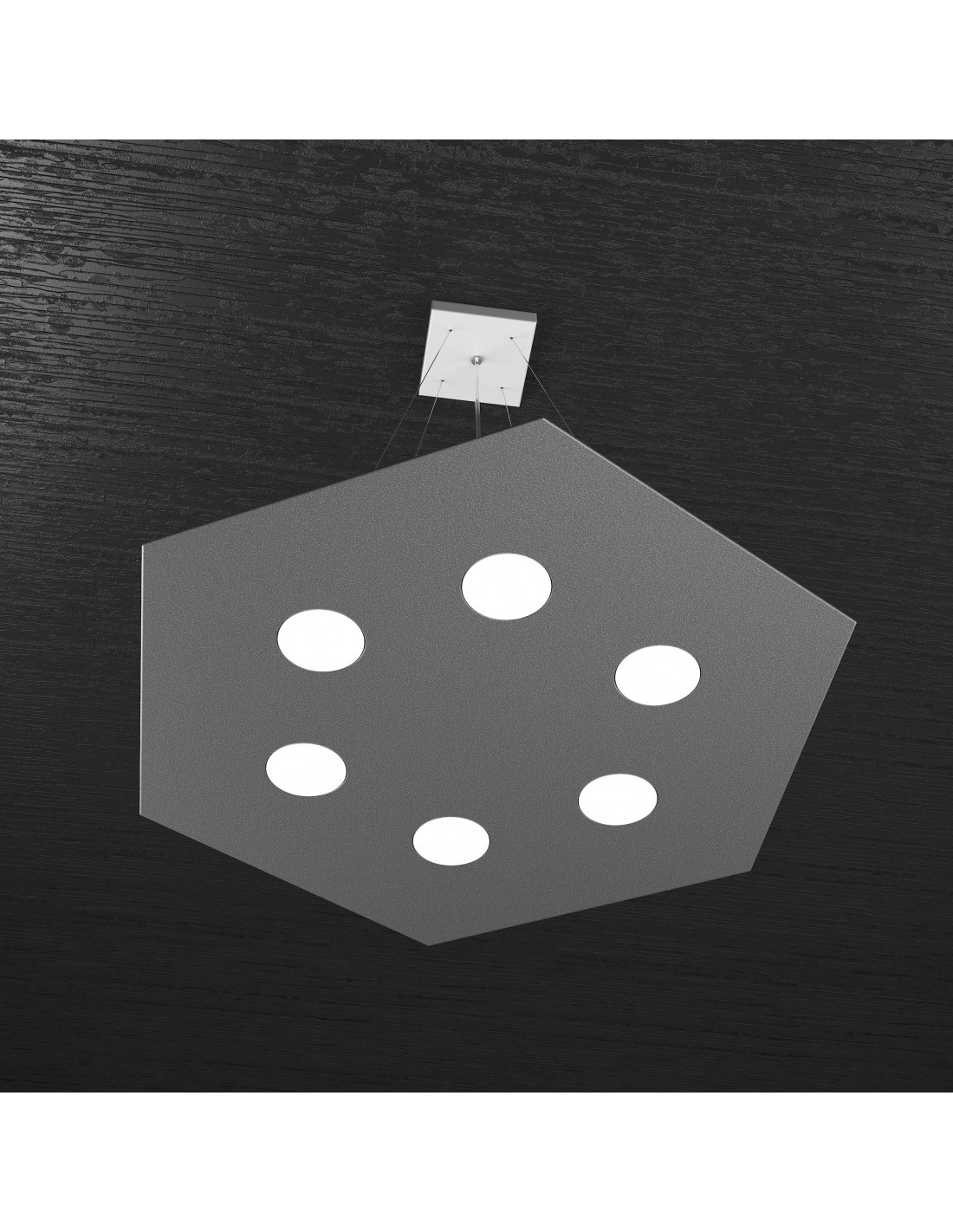 Questa sospernsione a 6 luci della collezione HEXAGON è composta da una sottile piastra a forma di esagono realizzata in metallo verniciato. Cavi regolabili in lunghezza.