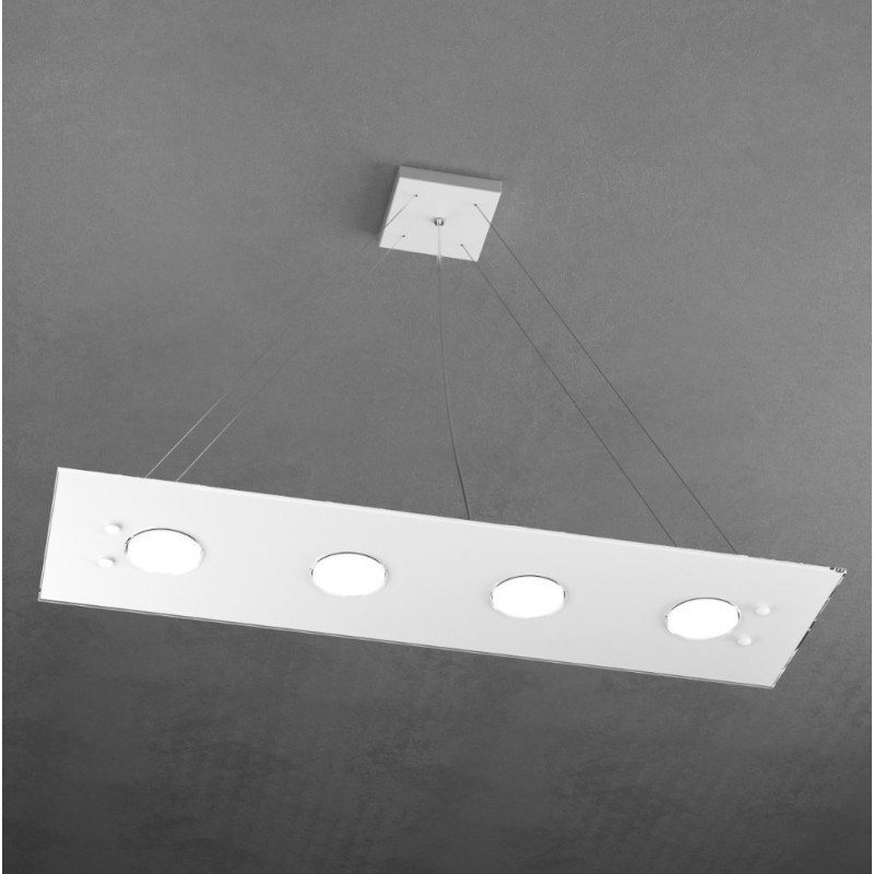 Questa sospensione della serie Path è composta da sottile lastra rettangolare in vetro extrachiaro il cui lato a vista è trasparente e impreziosisce la colorazione bianca retrostante. Rosone in metallo bianco e cavi d’acciaio regolabili in lunghezza.