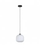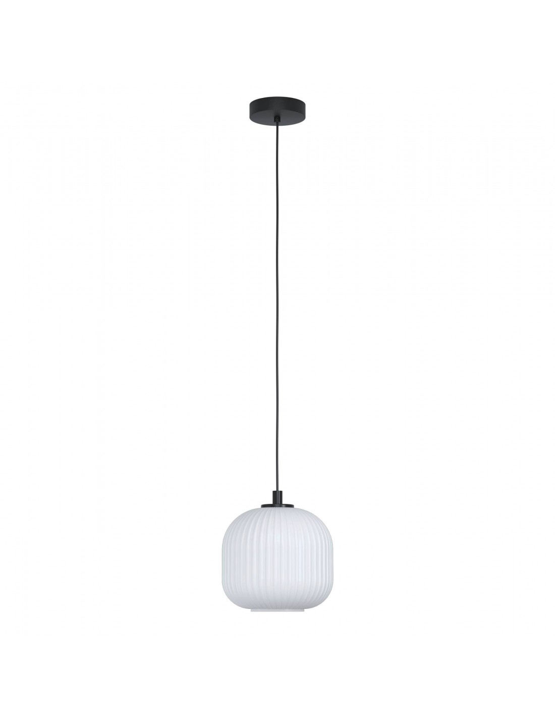 La sospensione MANTUNALLE del brand EGLO presenta una struttura in metallo finitura nero e diffusore in vetro rigato bianco dal diametro di Ø20 cm.