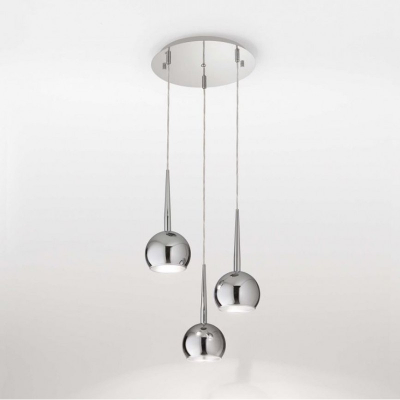 Sospensione a 3 luci della serie BOL di Affralux, realizzata con struttura in metallo cromato e finitura a specchio.