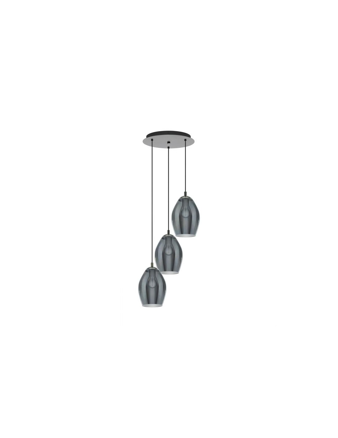 Il lampadario a sospensione ESTANYS del brand EGLO è composta da una struttura in metallo finitura nichel scuro con rosone rotondo, fili regolabili e 3 diffusori in vetro nero trasparente.