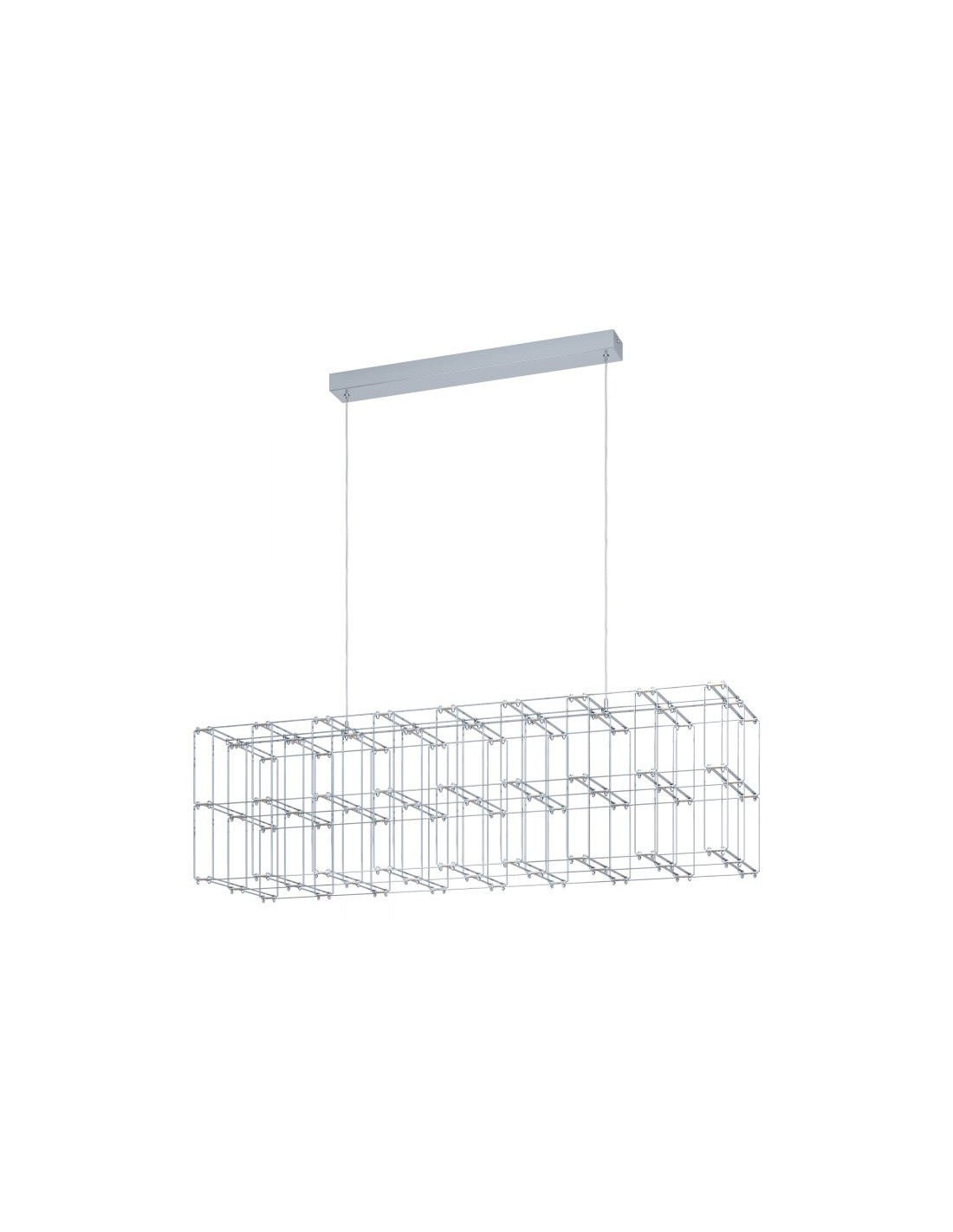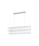 La lampada a sospensione FRONTERA del brand EGLO è composta da una montatura interamente in metallo cromato e diffusore a forma di gabbia rettangolare.