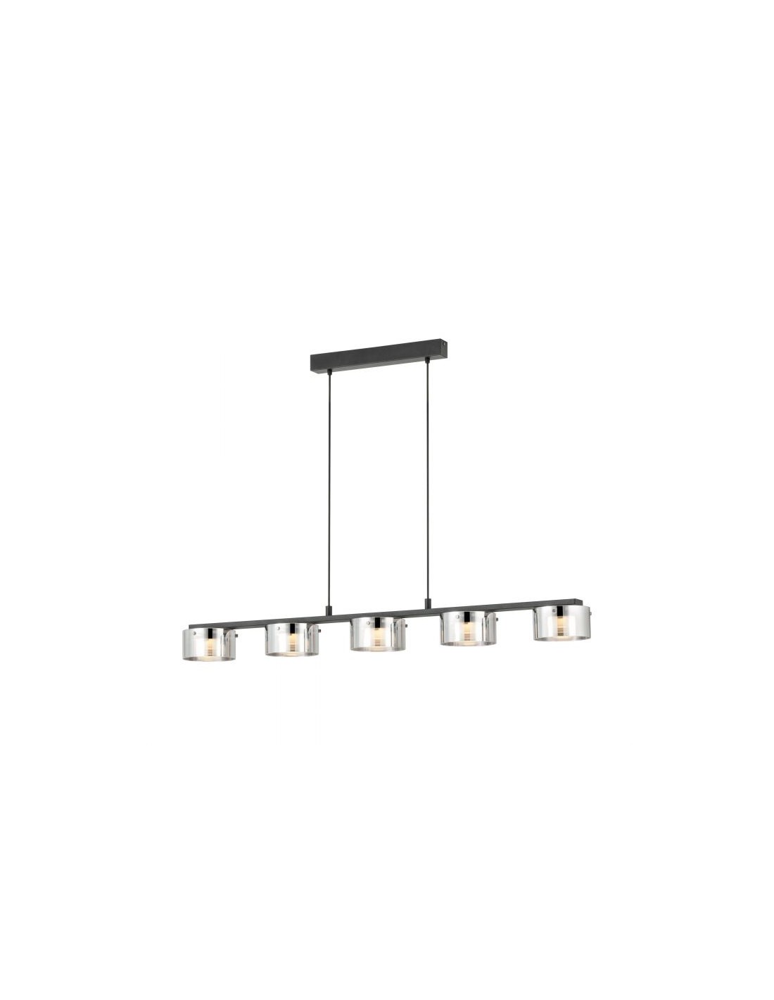 La lampada a sospensione COPILLOS del brand EGLO presenta un profilo in metallo finitura nero, cavi regolabili e 5 diffusori rotondi in vetro fumé.