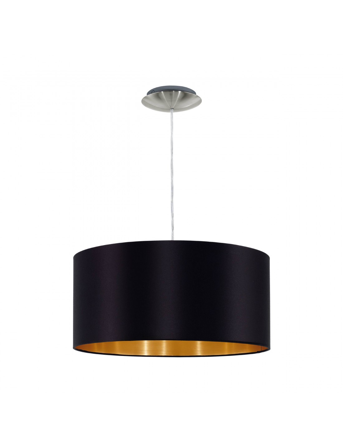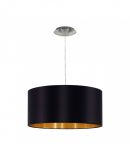 La sospensione MASERLO del brand EGLO presenta una struttura in metallo finitura nichel opaco con rosone rotondo, filo regolabile e paralume da Ø38 cm in tessuto nero con interno color oro.