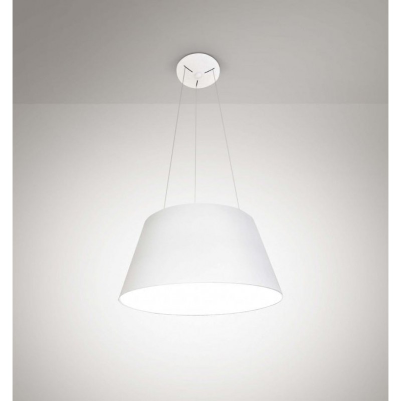 Sospensione della serie PARABOLE DIODI di Affralux, composta da un struttura rotonda spiovente aperta realizzata in alluminio verniciato bianco satinato, con schermo diffusore in PMMA.