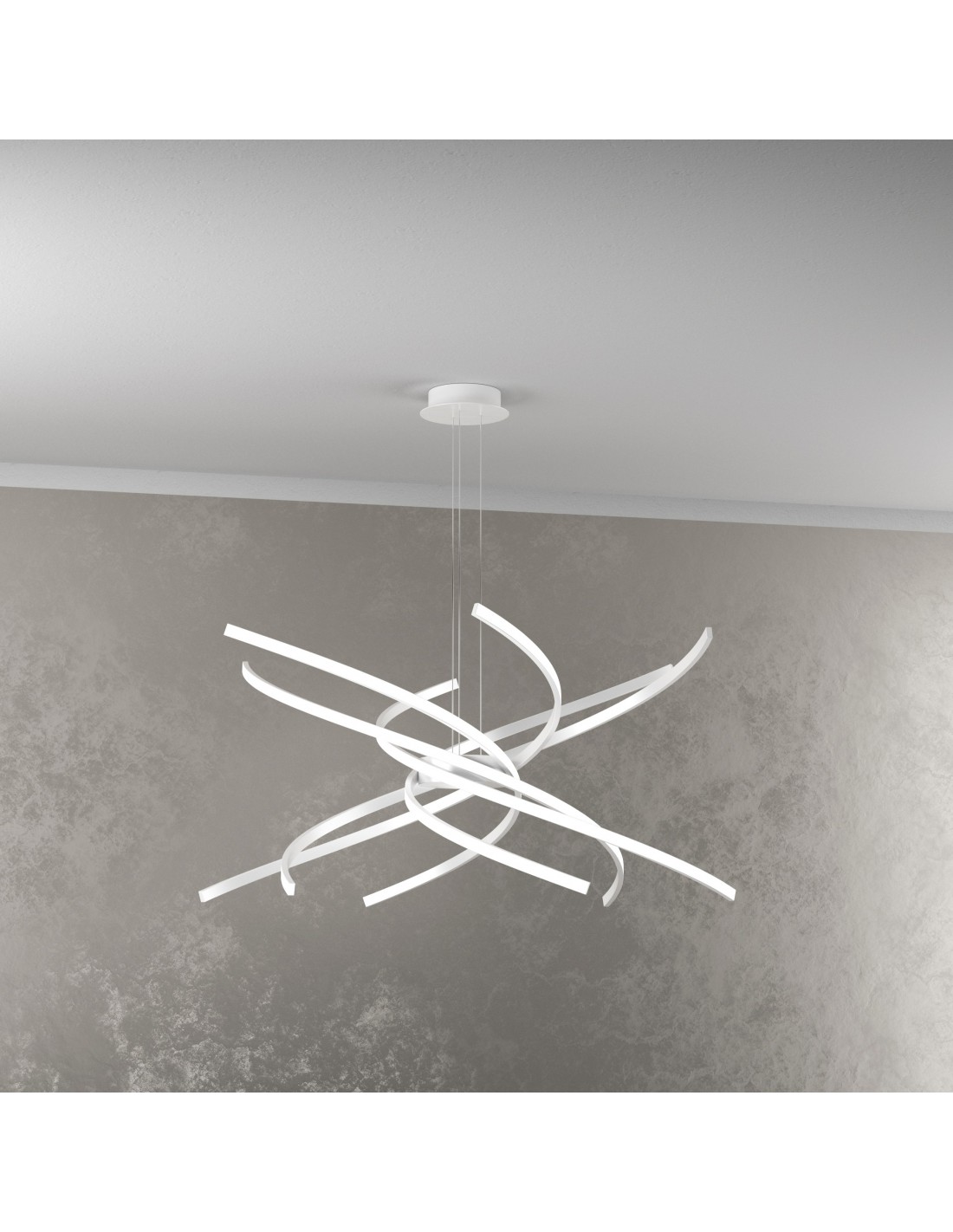 Questa sospensione della collezione TORNADO è realizzata con profili curvi di alluminio verniciato bianco, che intersecati fra loro creano un movimento circolare ampio ed allo stesso tempo essenziale.