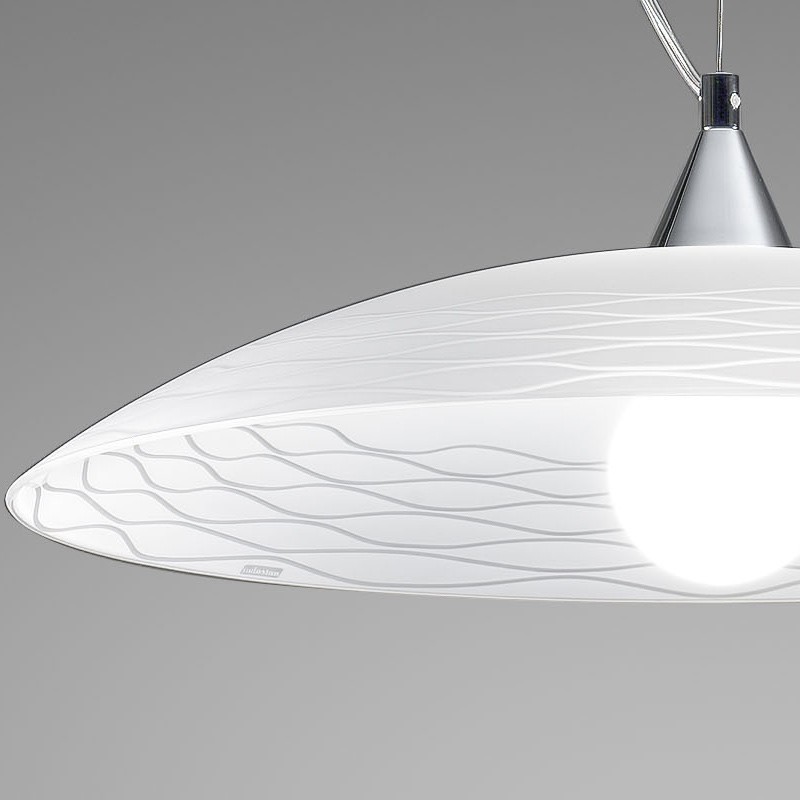 • Questa lampada sospesa moderna é composta da un diffusore in vetro extra-chiaro con decori a fili trasparenti. Struttura in laccato bianco con particolari in nikel satinato. Regolabile in altezza fino a 100 cm.