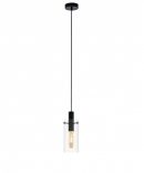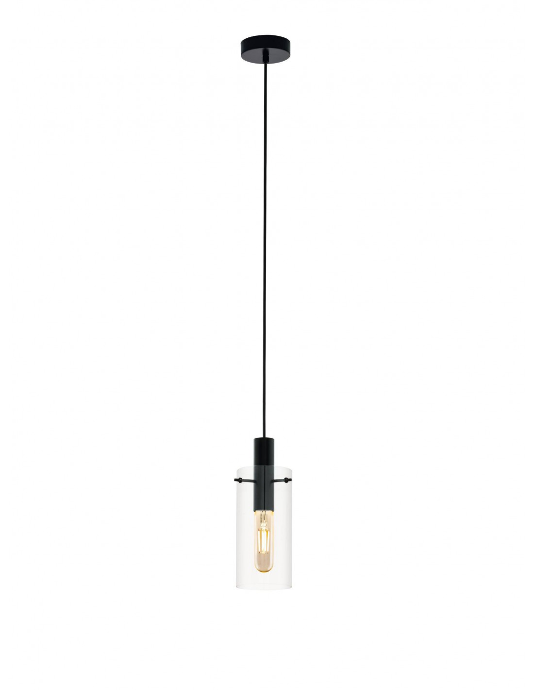 La sospensione MONTEFINO del brand EGLO presenta una struttura in metallo finitura nero e un diffusore cilindrico in vetro trasparente.