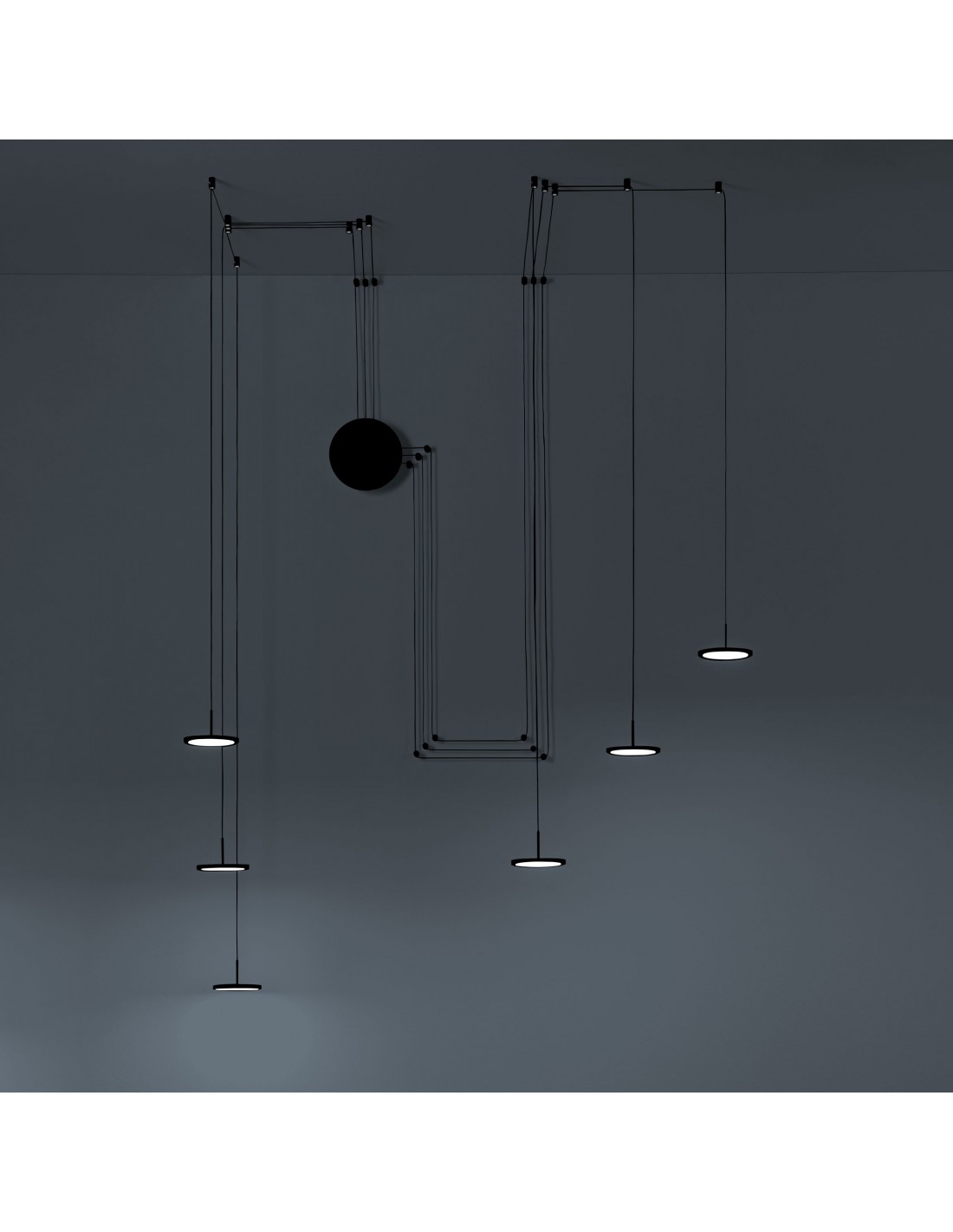 La sospensione con decentramento a 6 luci MYSTERY presenta una struttura in acciaio e alluminio finitura nero con 6 diffusori a forma di dischi piatti e sottili, ognuno da Ø13 cm. Cavi elettrici con lunghezza di 500 cm.