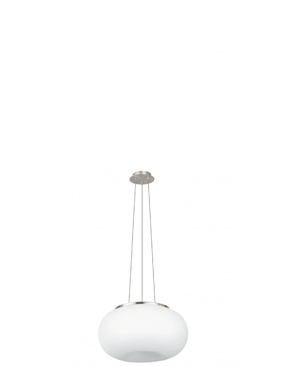 La sospensione OPTICA del brand EGLO presenta una struttura in metallo finitura nichel satinato e diffusore dalla forma particolare in vetro opale bianco.