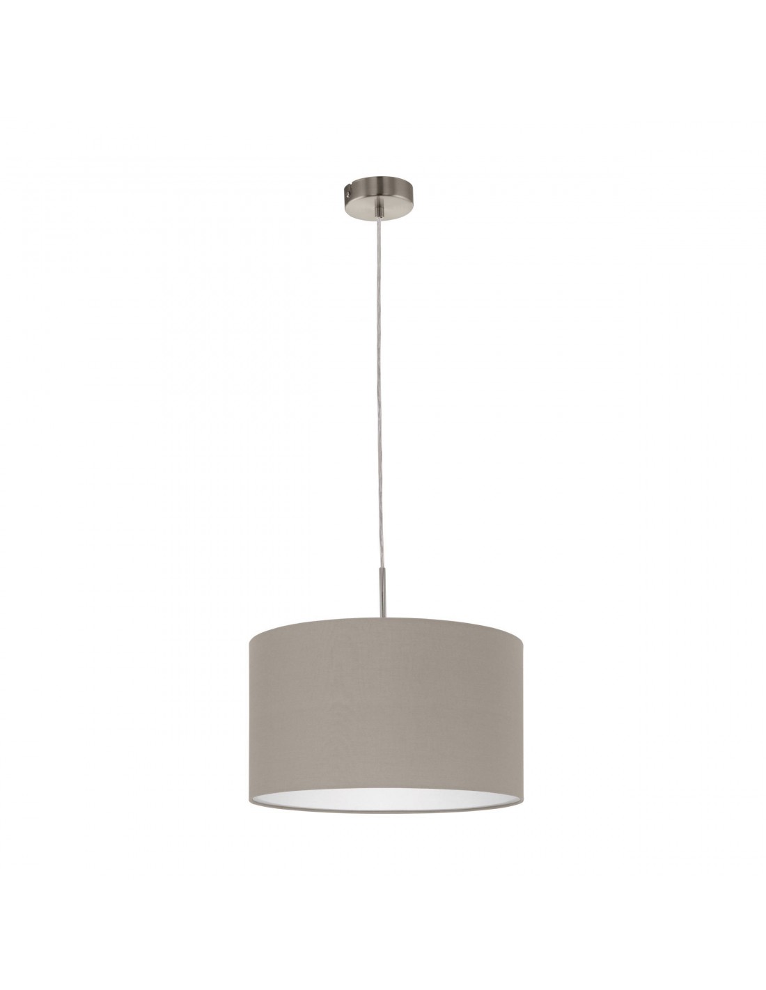 La sospensione PASTERI del brand EGLO presenta un profilo in metallo finitura nichel opaco con rosone rotondo, cavo regolabile e paralume realizzato in lino dal diametro di 38 cm colore tortora.