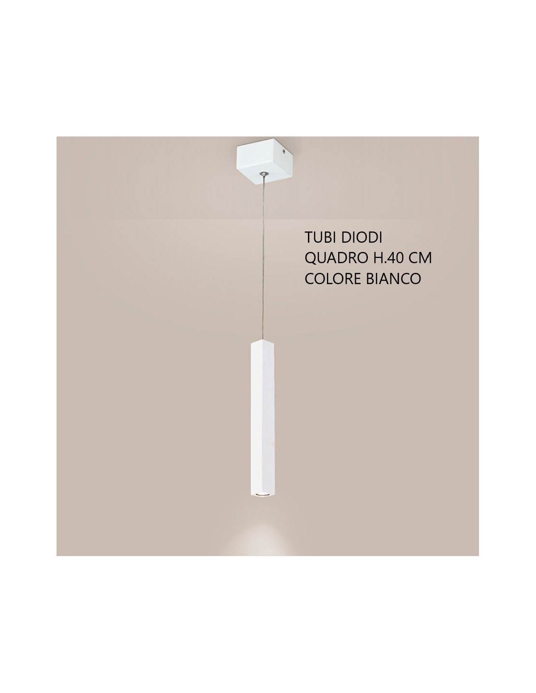 Sospensione singola della serie TUBI DIODI di Affralux, composta da un cilindro a sezione quadrata in metallo verniciato bianco, finitura sabbiata. Lunghezza cilindro di 40 cm.