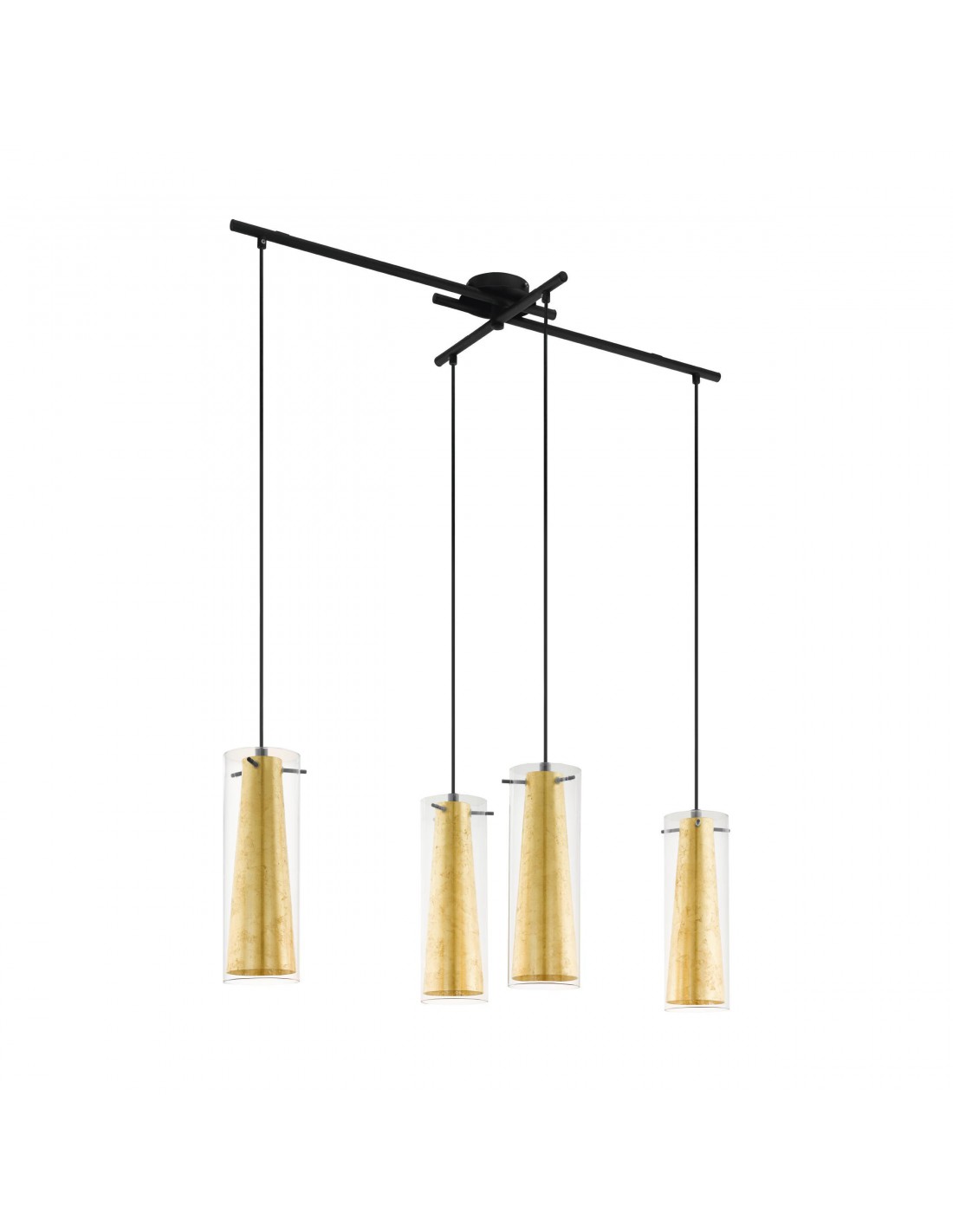 La lampada a sospensione PINTO GOLD del brand EGLO presenta un profilo in metallo finitura nero con 3 bacchette, fili pendenti su ogni estremità e 4 diffusori composti ognuno da due vetri, uno interno a forma di cono decorato in foglia oro e uno esterno tubolare trasparente.