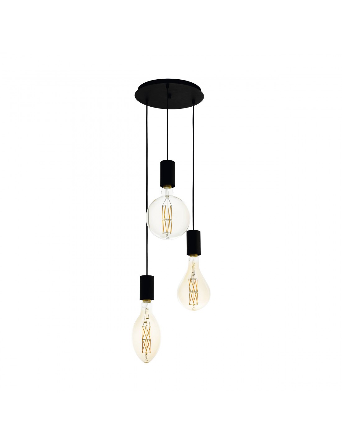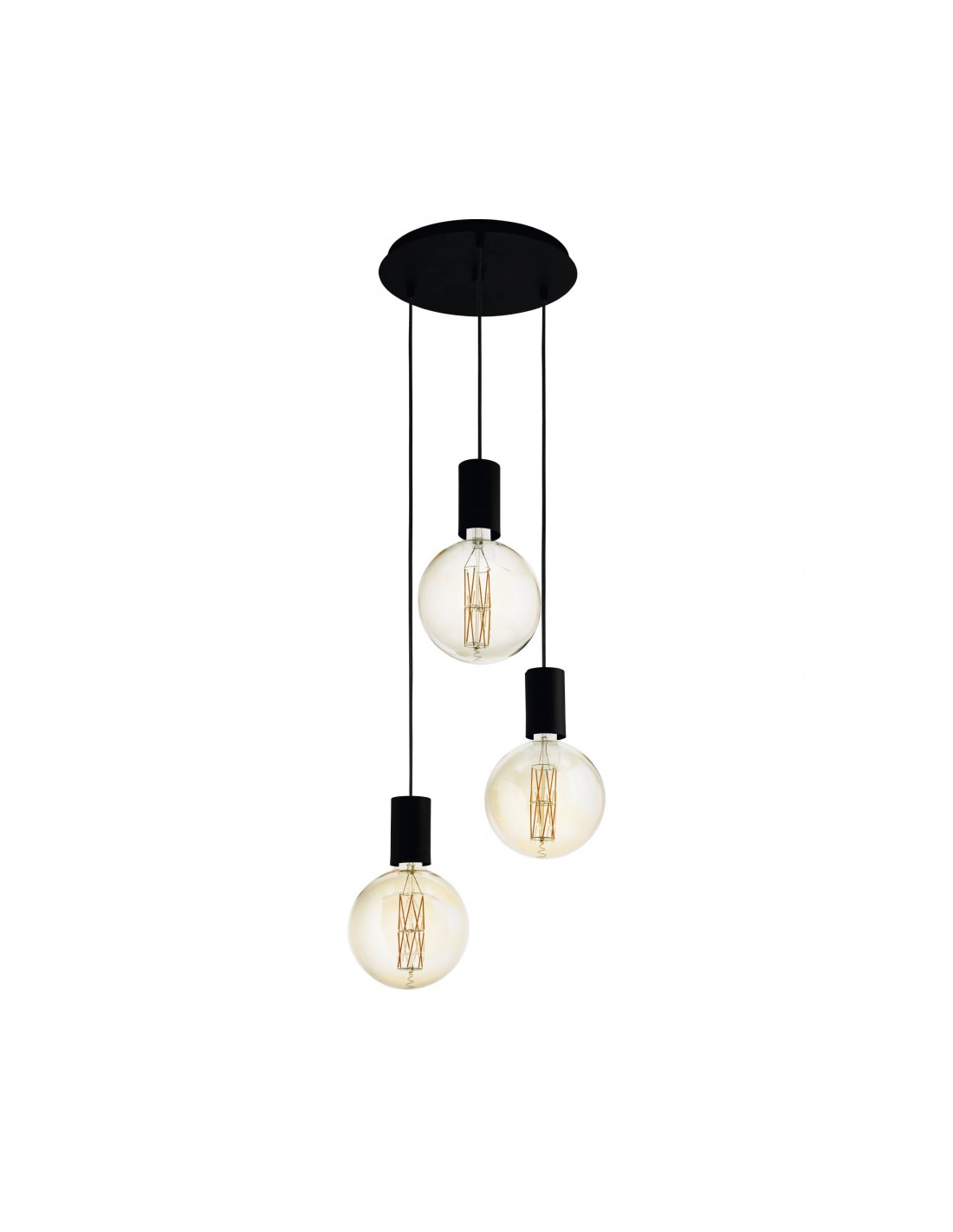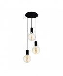 La lampada a sospensione POZUETA del brand EGLO presenta una struttura semplice in metallo finitura nero composta da rosone rotondo, cavi regolabili e 3 portalampada E27.