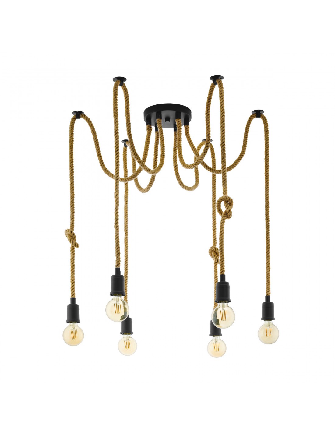 La sospensione RAMPSIDE del brand EGLO presenta una struttura in metallo finitura nero, cavi elettrici ricoperti interamente in corda di canapa naturale decorativa e 6 portalampada E27.
