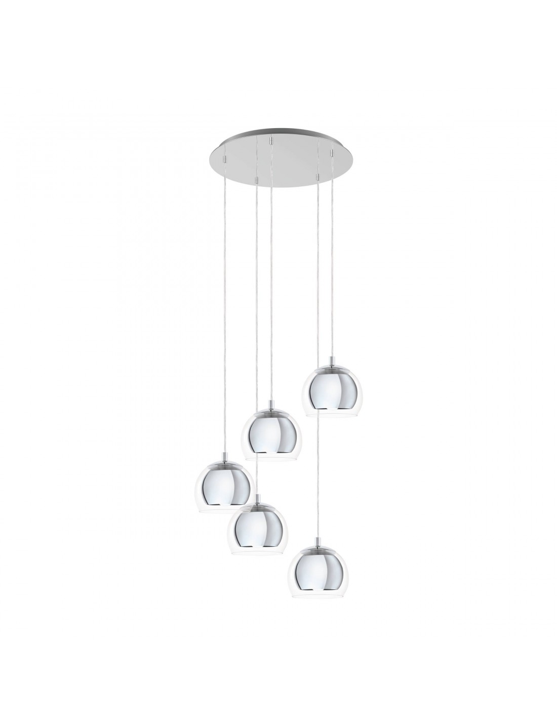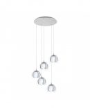 La sospensione ROCAMAR del brand EGLO presenta una struttura rotonda in metallo cromo. I 5 paralumi a forma di sfera in tinta con la struttura e sono avvolti da vetro trasparente.